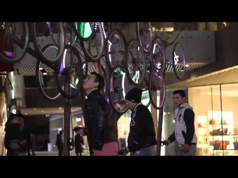This lighting display promotes the use of bicycles to reduce pollution and actively interacts with the public to promote awareness. The installation contains spinning bicycle wheels covered in LED lights that can present a wide range of patterns and colors live. The wheels are spun by both motorized means as well as the manual input of the pedals near the base of the piece, to be spun by any oncoming observers. The interactive nature of the piece invites the audience to join in and emphasizes how we can individually contribute to a more beautiful world.